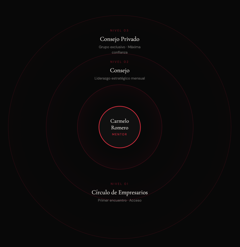 El acceso es únicamente por invitación personal de Carmelo Romero. No existe inscripción abierta. Carmelo conoce a cada empresario antes de su incorporación al círculo.